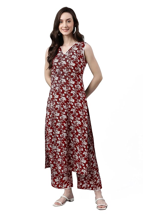 IndiBloom Women’s Maroon Floral Cotton Co-ord Set – Straight Fit Casual Wear